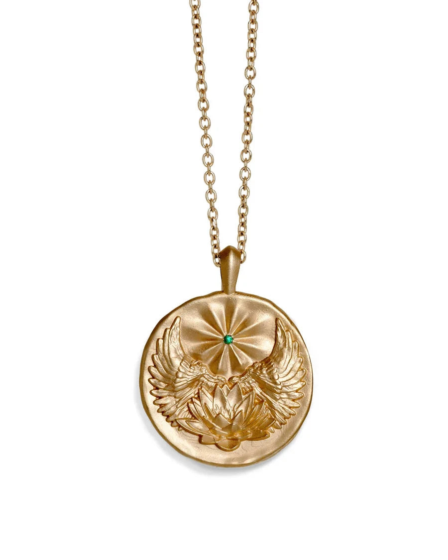 Esta pieza honra el camino del alma durante el proceso de evolución y de crecimiento interior. Una pequeña esmeralda mantiene la vibración de Anahata (chakra corazón) durante el recorrido.