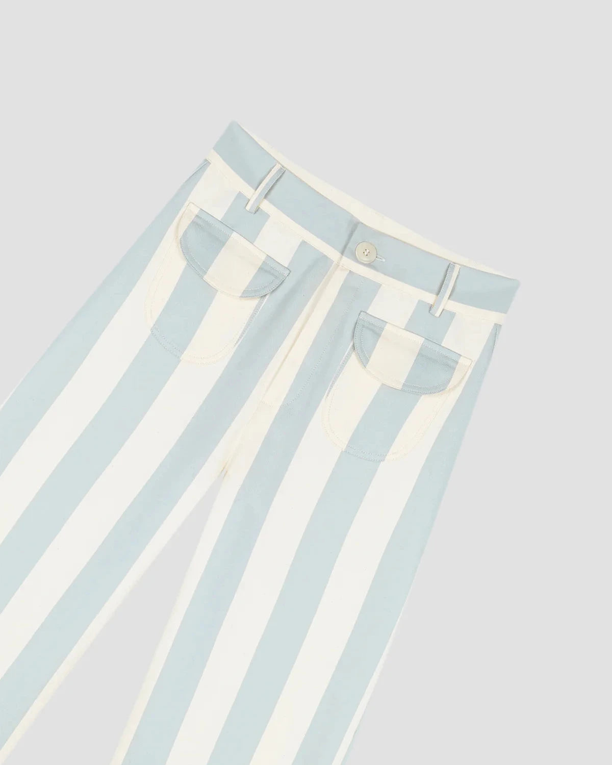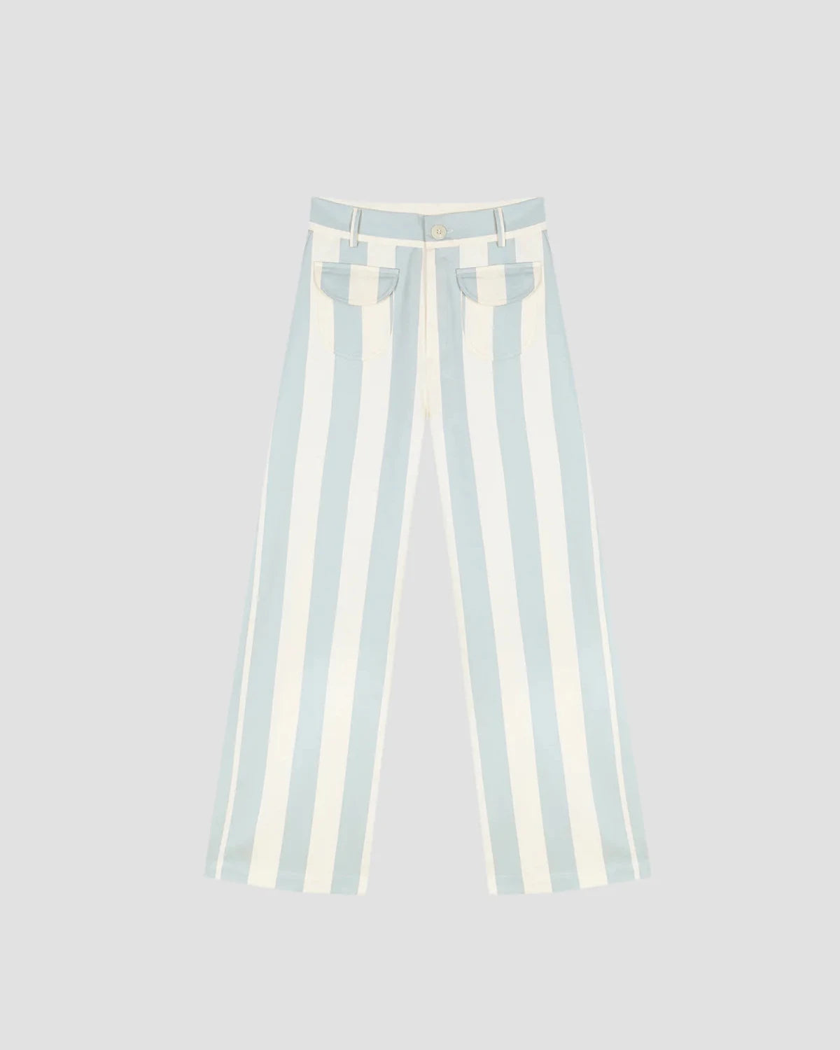 Light blue high-waisted trousers printed in cotton with celeste and ecru stripes.