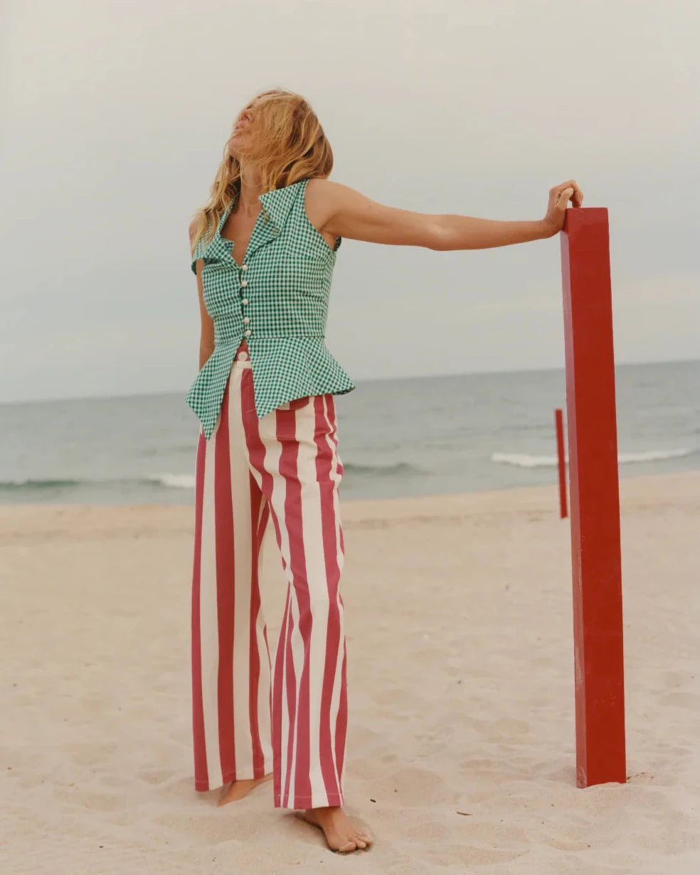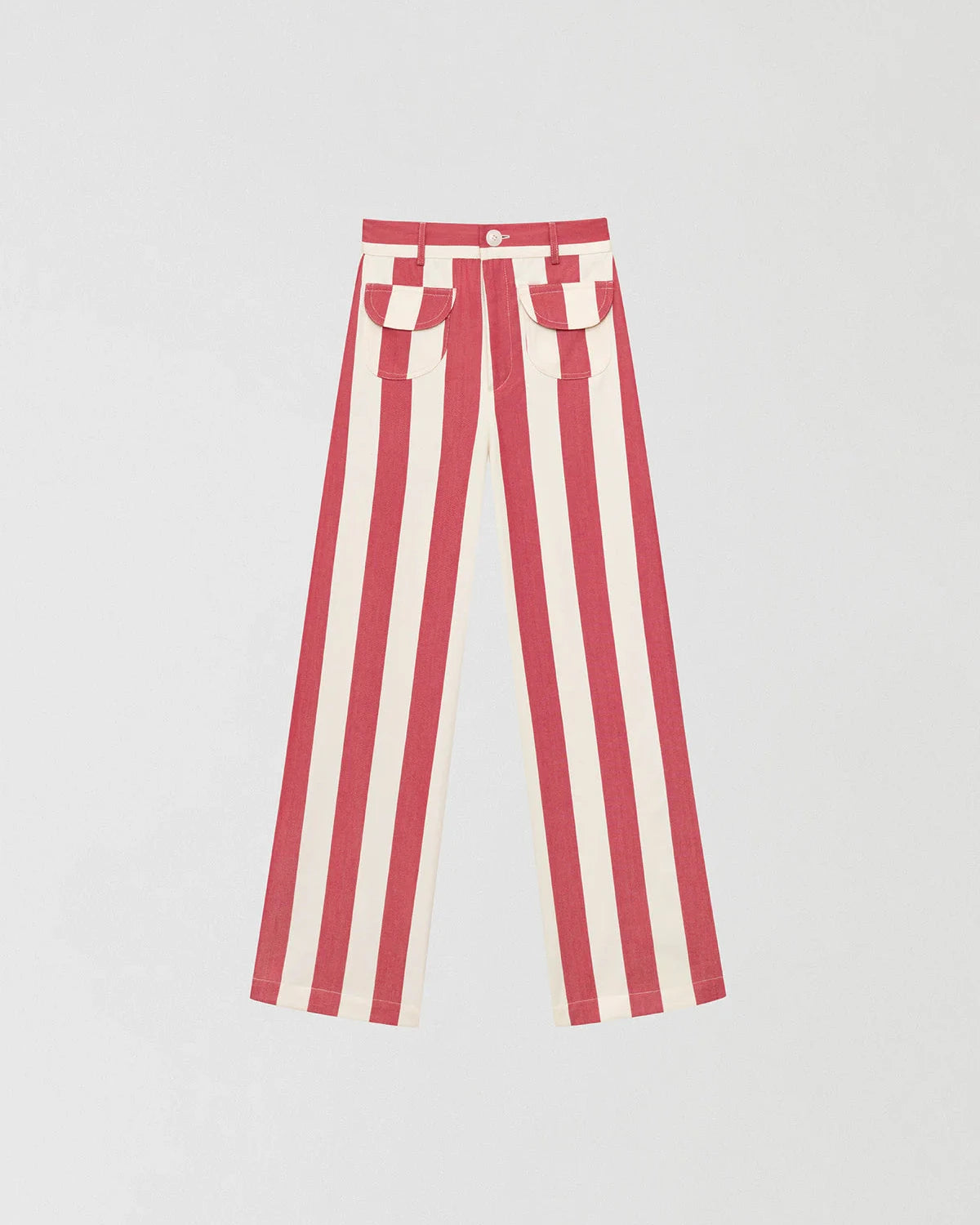 Red high-waisted trousers printed in cotton with red and ecru stripes.