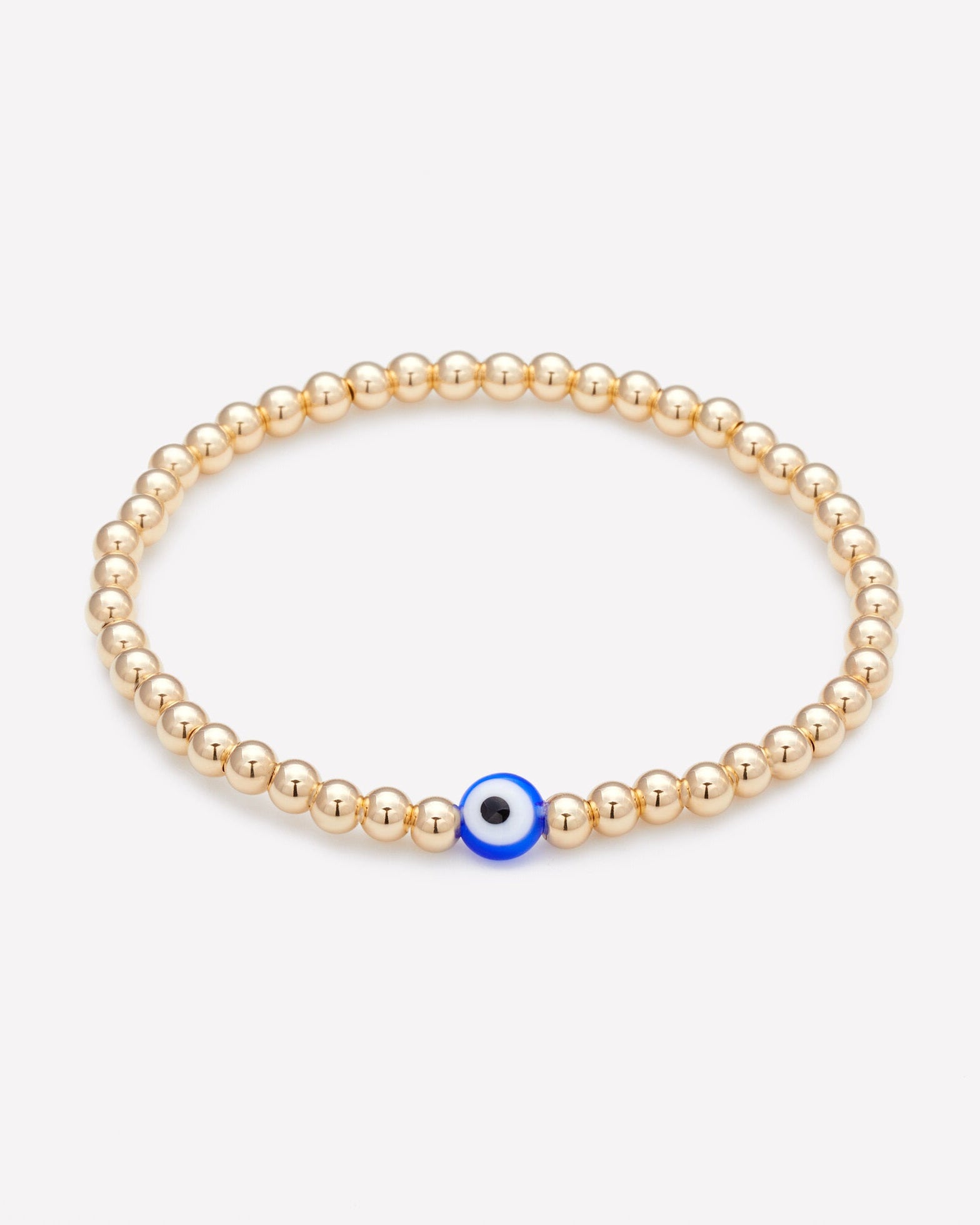 4MM 14K Yellow Gold beaded bracelet for women with glass evil eye on clear elastic.