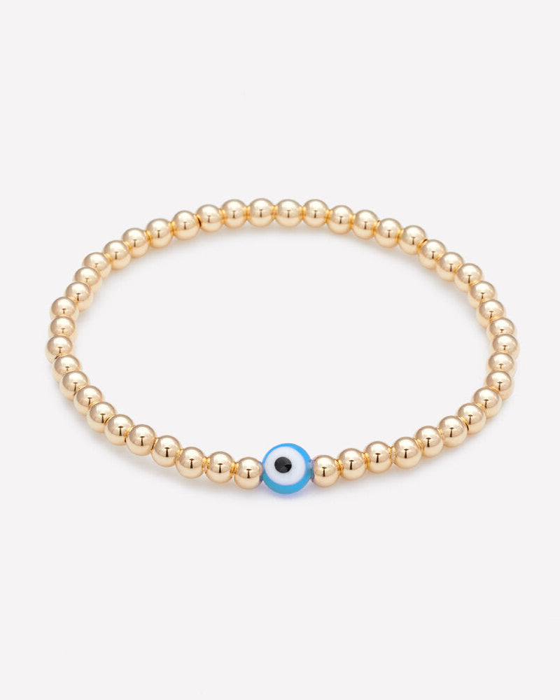 4MM 14K Yellow Gold beaded bracelet for women with glass evil eye on clear elastic.