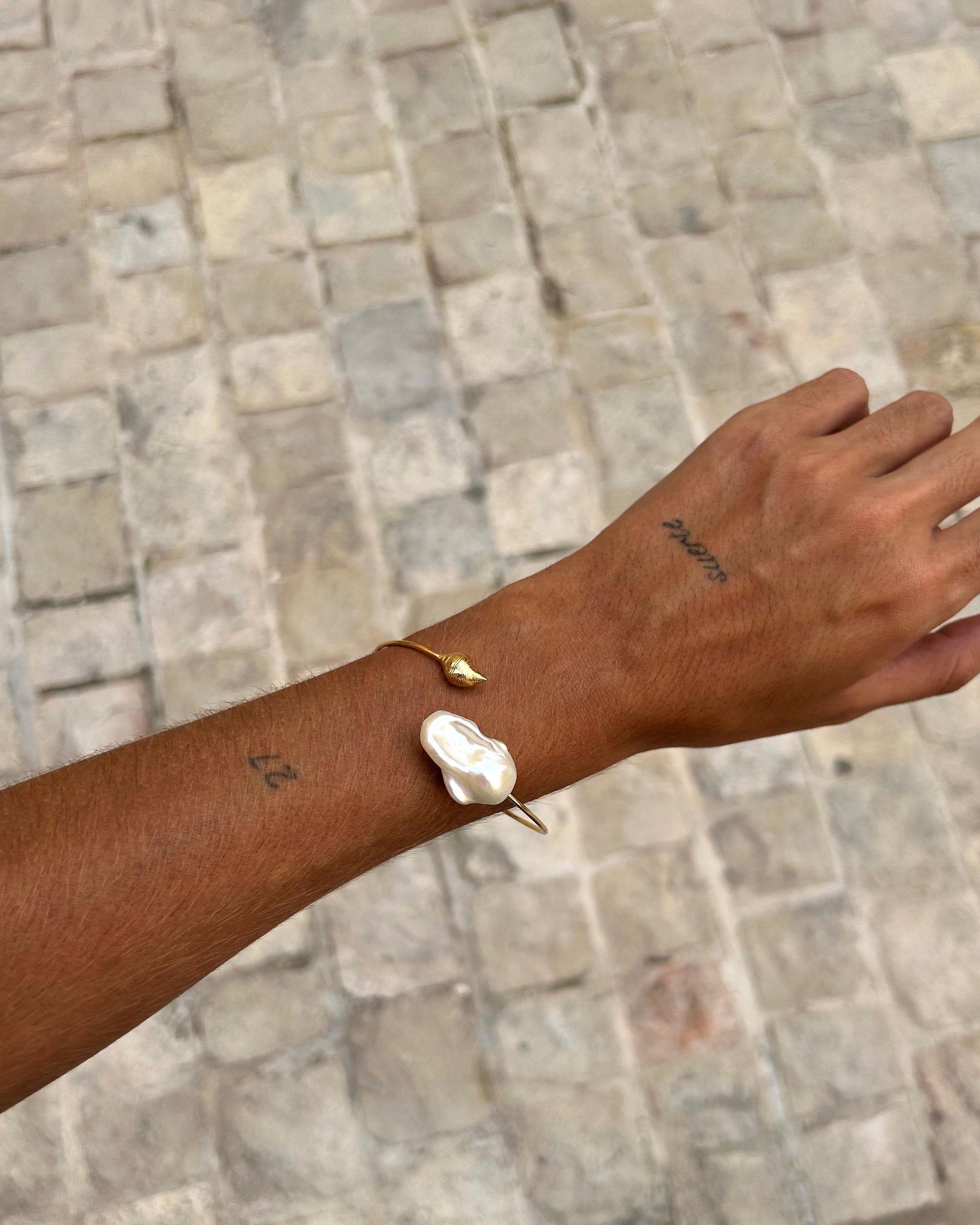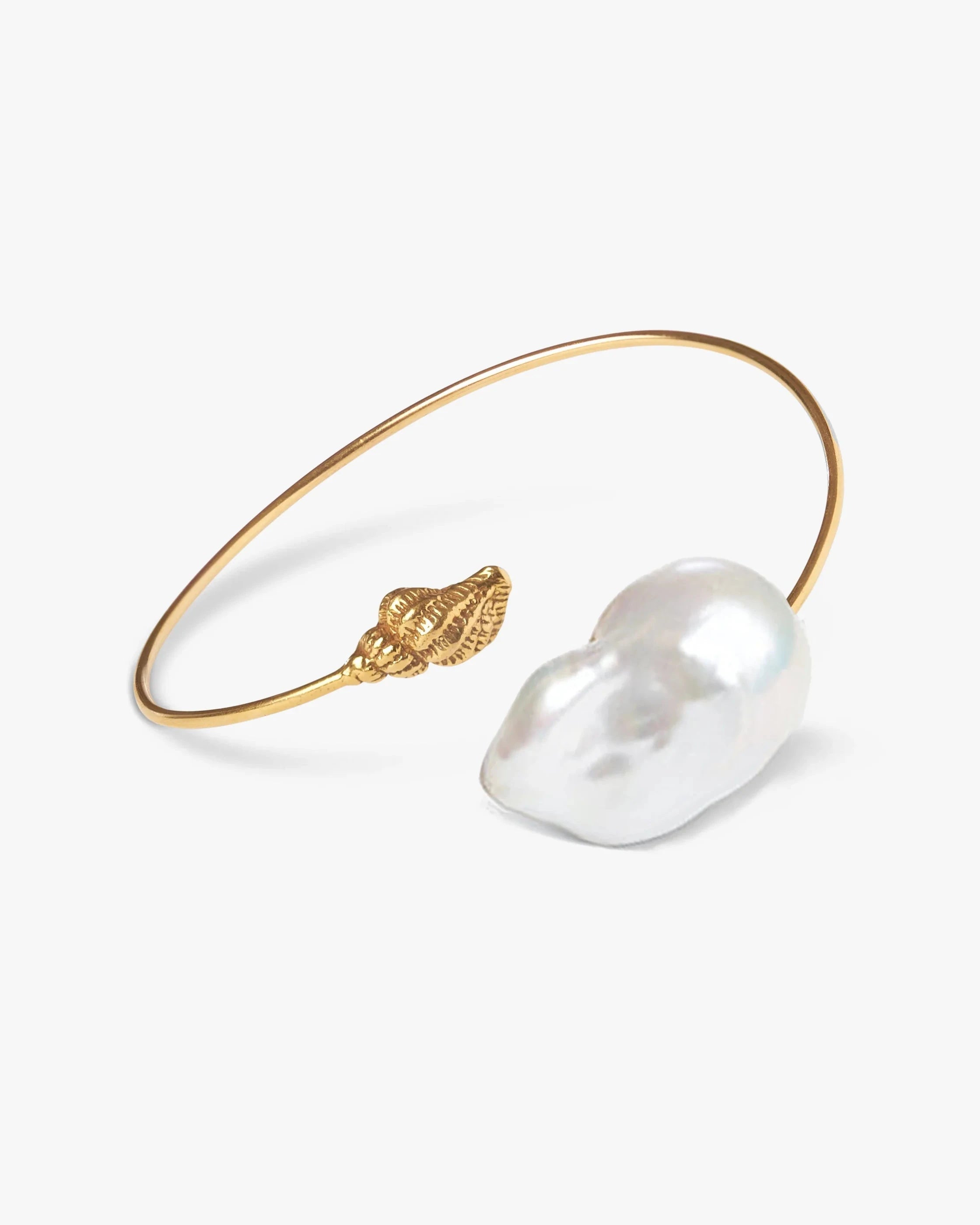 A stylish tribute to the pearl's oceanic origins, this open-ended bracelet is a harmonious blend of classic and contemporary. Embellished with a round white pearl and conch charm against a gold vermeil bracelet, this bracelet adds a unique charm to any outfit. Let the stunning combination stand out on its own, or make it the most distinctive part of a stack.