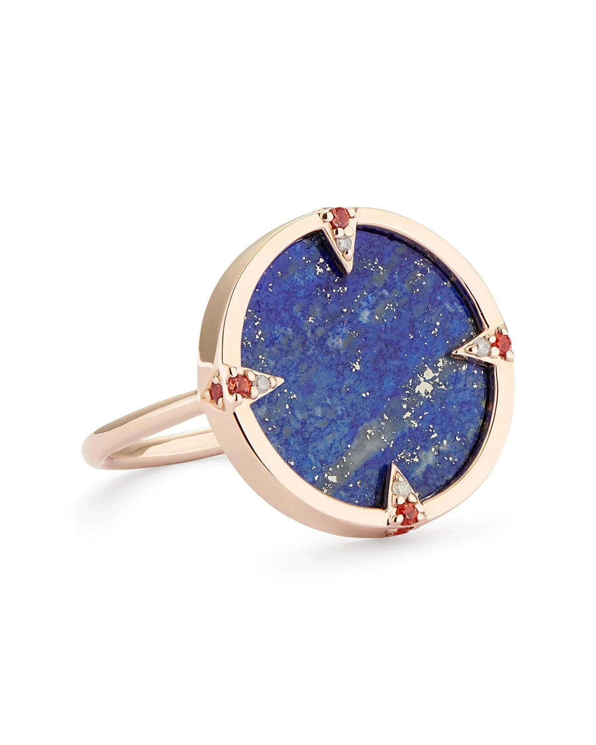 Expertly crafted in 18K yellow gold, the SAMANTHA TEA AURA ring showcases a stunning flat round Lapis Lazuli cabochon, surrounded by vibrant Orange Sapphires and subtle Grey Diamonds. This sophisticated combination highlights intricate craftsmanship while offering a unique blend of rich color and understated elegance, perfect for those seeking a distinctive and refined statement piece.