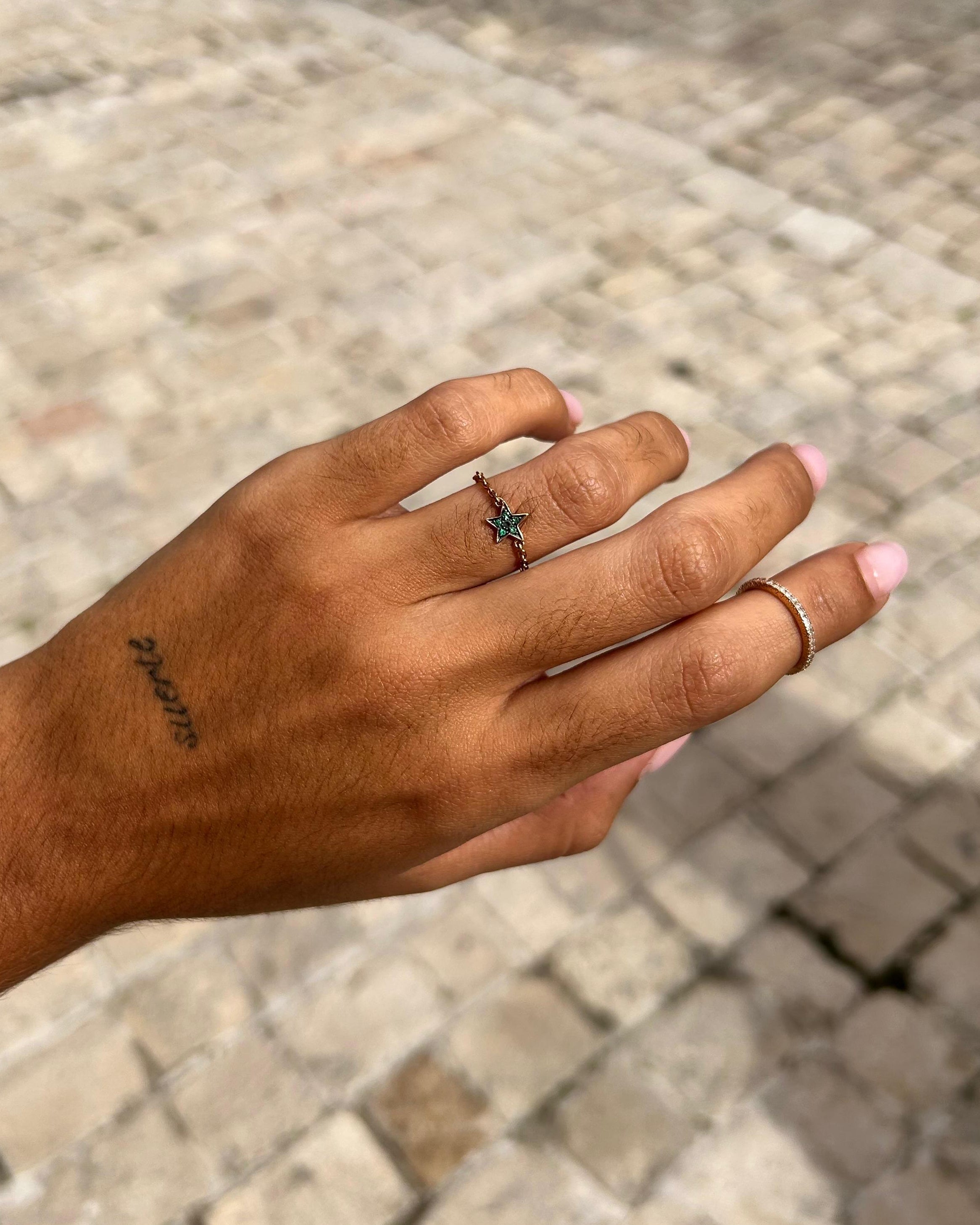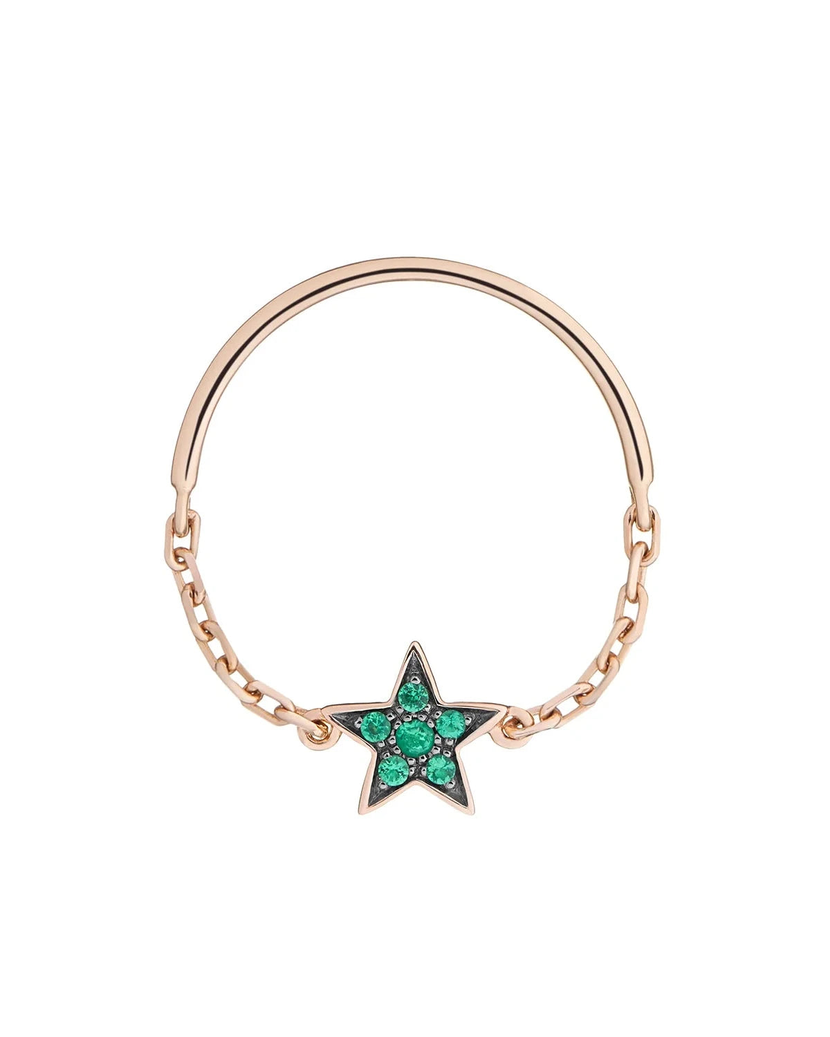 Handcrafted from 18K gold, the SAMANTHA TEA LONE STAR CHAIN RING EMERALDS blends a solid gold band with a fluid link chain for a distinctive look. Its centerpiece is a star adorned with vibrant emeralds, enhanced by a sleek black rhodium finish. This ring offers a refined balance of elegance and contemporary design, perfect for those who appreciate expert craftsmanship and unique detail.