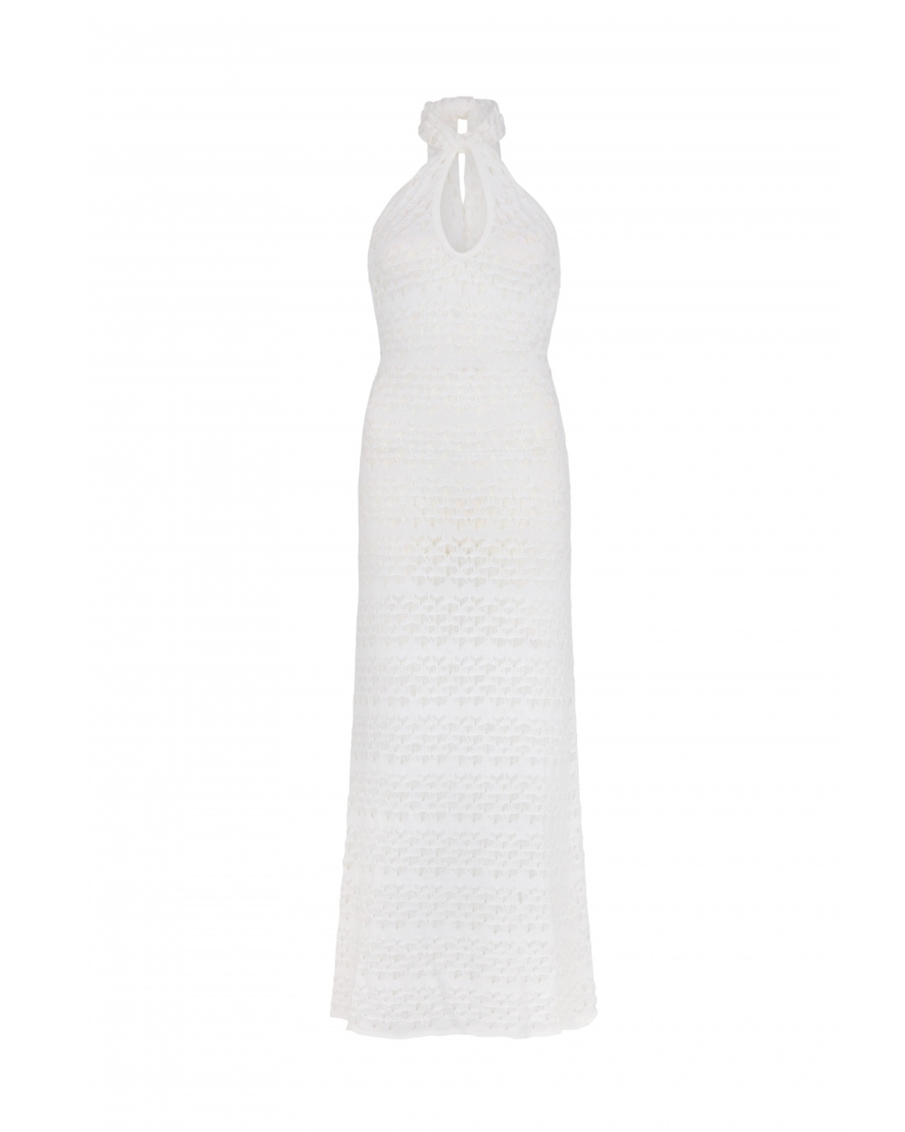 This summer maxi dress features a halter neck with adjustable side ties for a tailored fit. The front keyhole detail adds subtle elegance, while the exposed shoulders and back enhance its breezy, sophisticated appeal. Designed with an A-line silhouette, it offers graceful movement and a flattering shape, perfect for warm-weather occasions. The crisp white fabric ensures a fresh, timeless look.