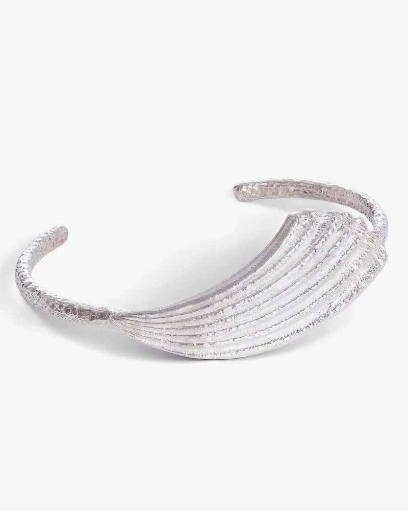 Add a touch of sophistication to your everyday style with this stunning textured bangle. The ridged curve design, crafted from genuine Mauritian shell and set against a beaten cuff in silver, makes this bracelet a standout piece.