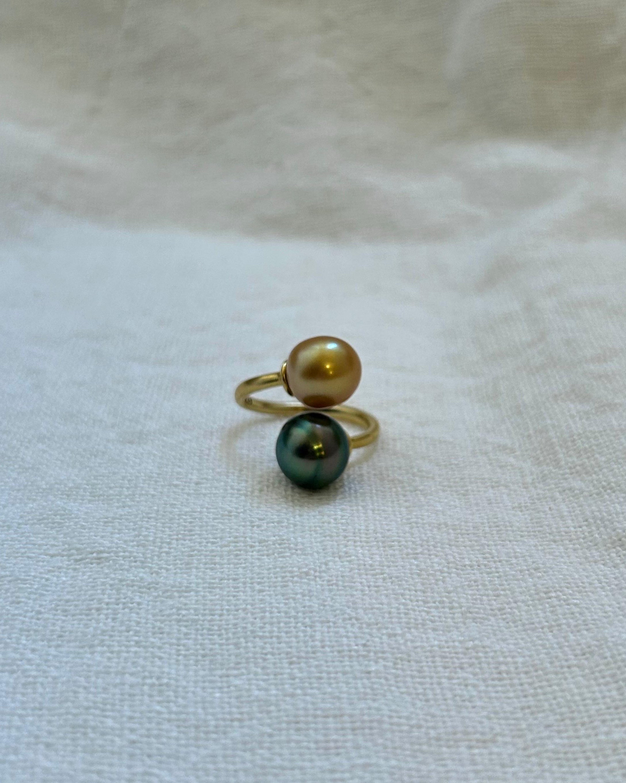 The Oceano Jewels Trou d'Eau Douce Ring showcases the exquisite combination of an 11mm Tahitian pearl and an 11mm South Sea gold pearl, set in elegant gold. This harmonious pairing highlights the natural luster and rarity of both pearls, creating a statement piece that embodies sophistication and refined craftsmanship. Perfect for collectors and connoisseurs, this ring balances boldness with timeless elegance.  |
