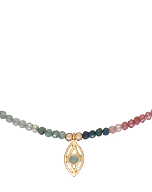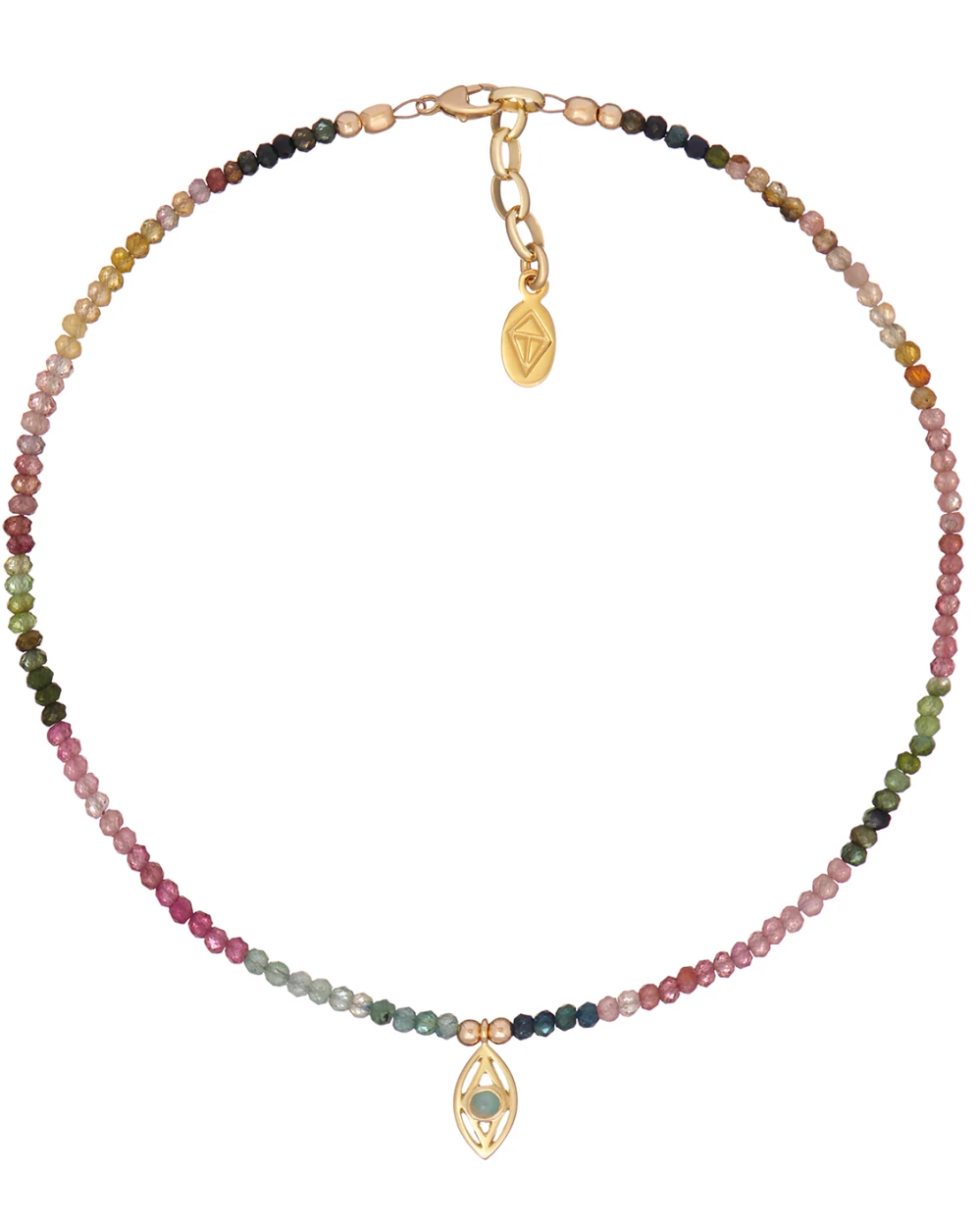 Crafted in 9K yellow gold, the Samantha Tea Eye of Magic Bead Necklace features a captivating eye motif adorned with luminous moonstone, vibrant turquoise, and tourmaline accents. This adjustable piece blends mystical symbolism with refined elegance, offering versatility and a unique statement for any collection. Expertly designed, it balances color and craftsmanship to enhance both casual and formal ensembles.