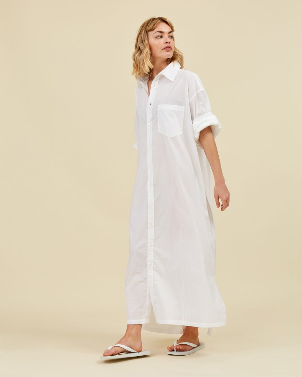 Crafted from pure white cotton poplin, the SEAMEHAAPY GEENAH Shirt Dress offers a lightweight, breathable option ideal for warm weather. Its long silhouette combines classic shirt elements with a relaxed fit, ensuring both comfort and elegance. Designed for versatility, this dress transitions seamlessly from casual daywear to a polished evening look, making it a sophisticated addition to any wardrobe. The crisp fabric and timeless design underscore its lasting appeal and quality construction.