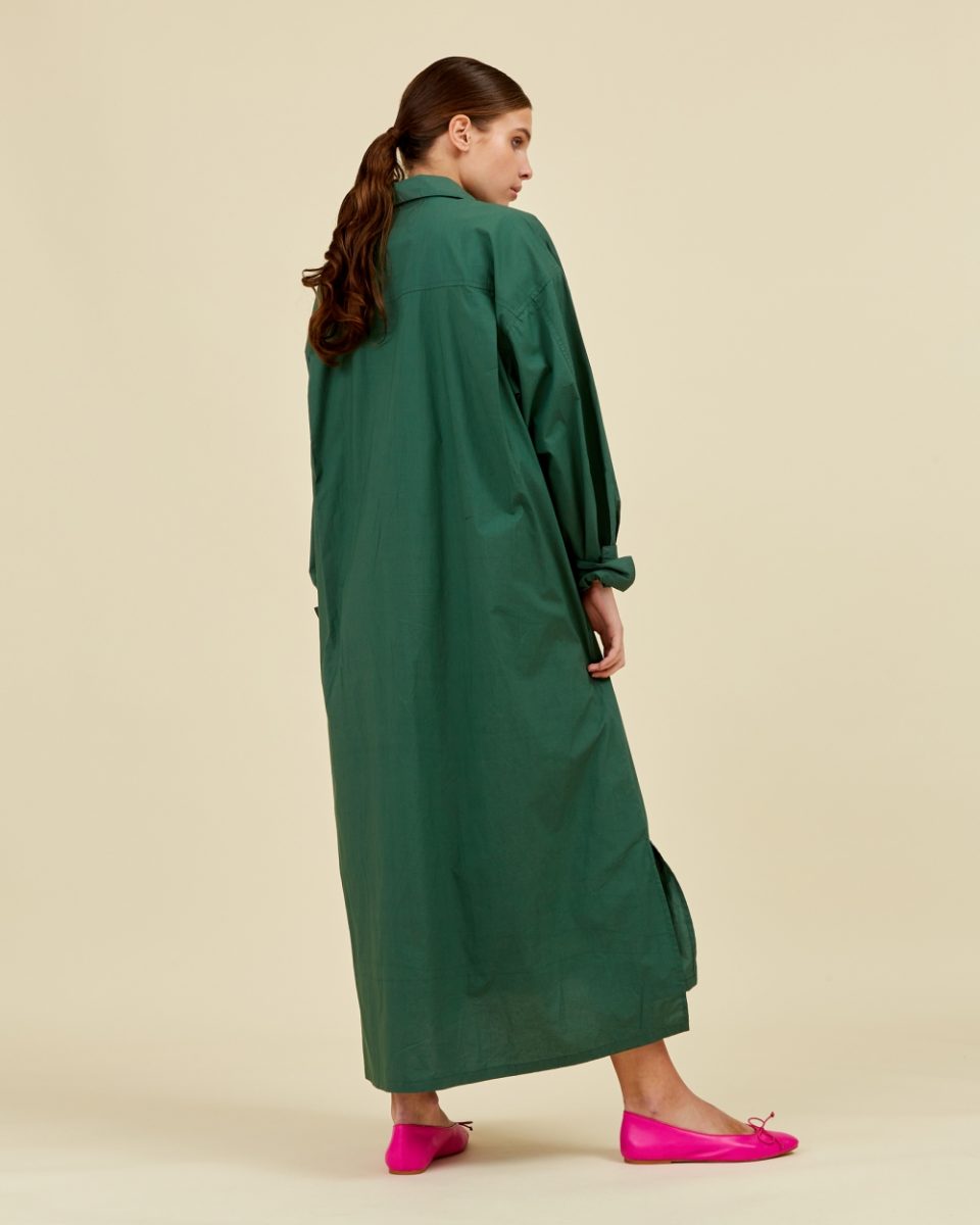 This SEAMEHAPPY GEENAH long shirt dress is crafted from 100% cotton poplin in a deep forest green shade, offering both breathability and durability. Its tailored cut and classic shirt dress design combine comfort with a sophisticated silhouette, making it a versatile piece for various occasions. The natural cotton fabric ensures softness against the skin and easy care, while the rich green hue adds a timeless elegance to your wardrobe.