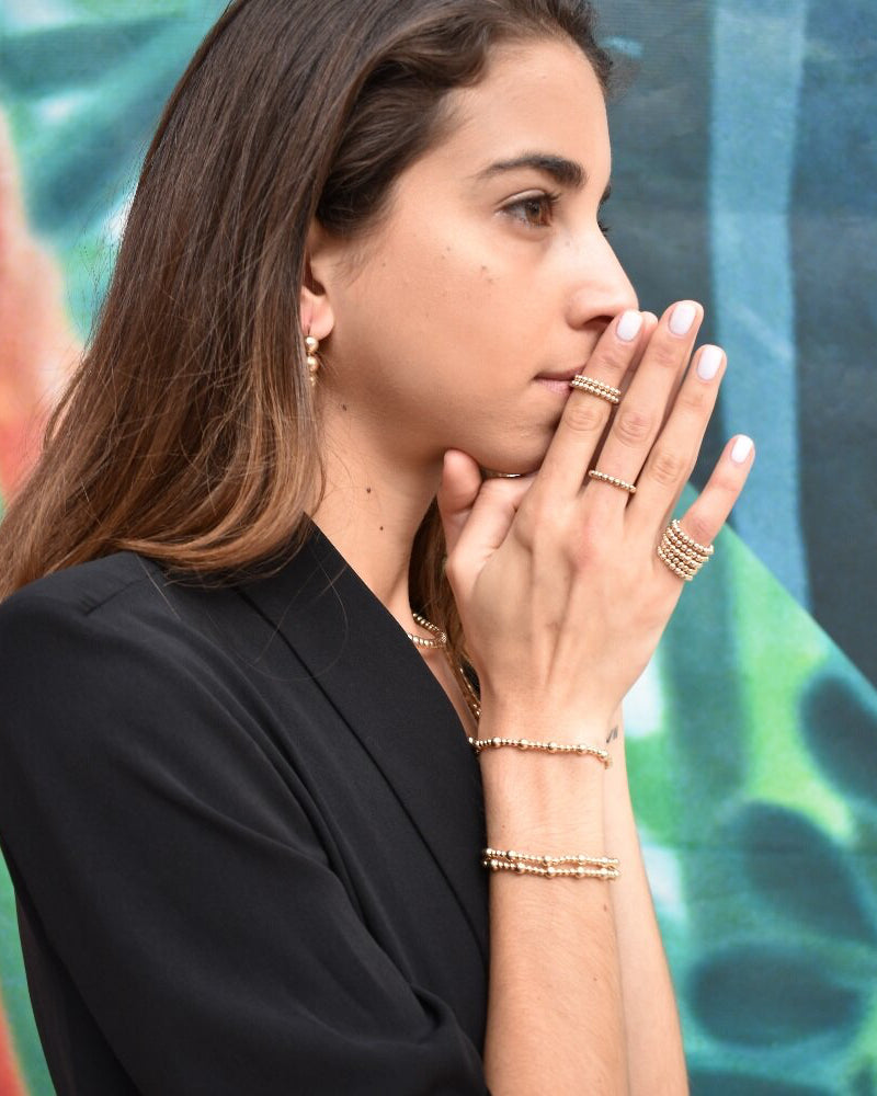 3MM beaded ring for women on clear elastic in yellow gold or silver.