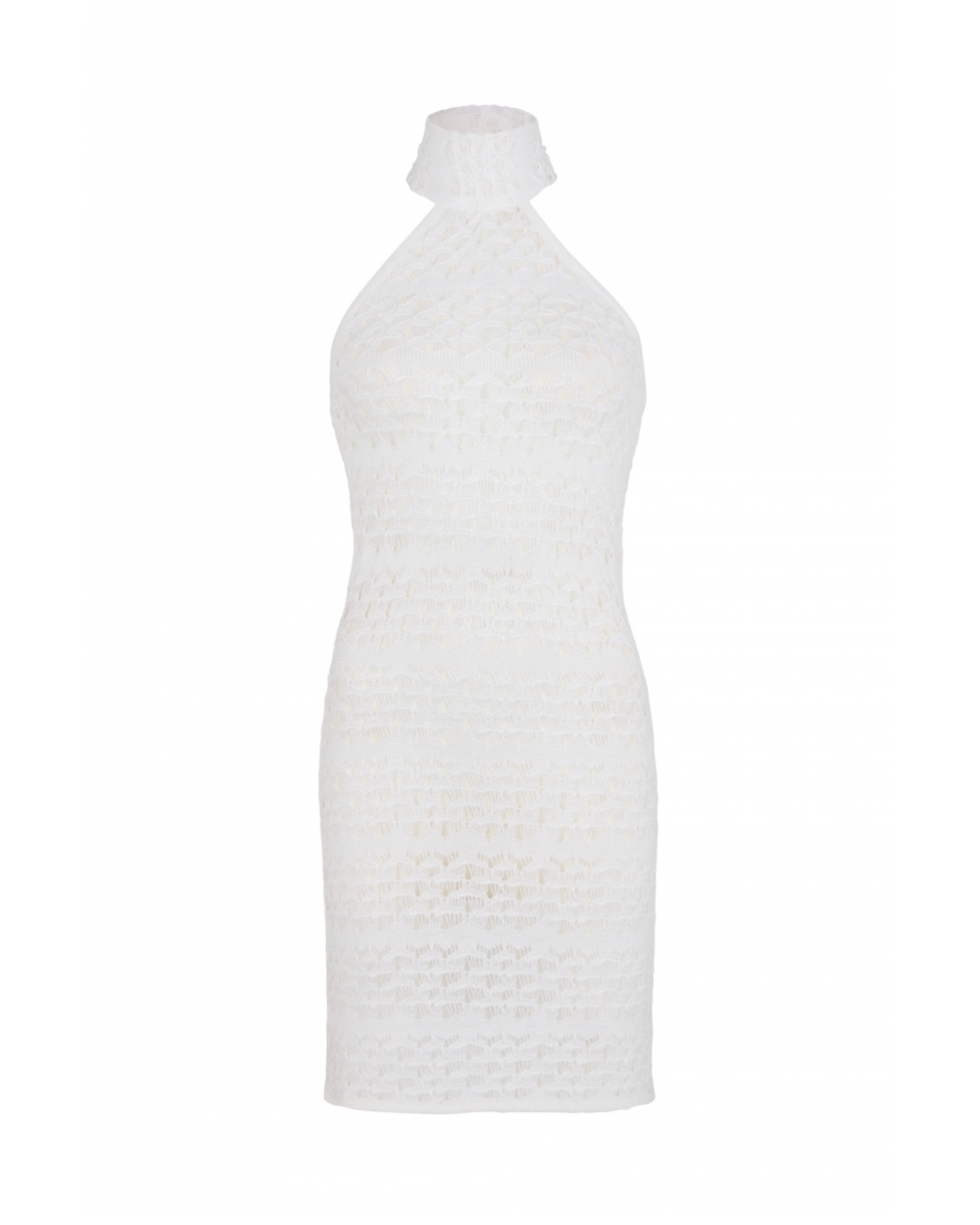 Summer mini dress with asymmetric armhole design with exposed shoulders and back featuring high halter-neck tie that drops in a body skimming silhouette.